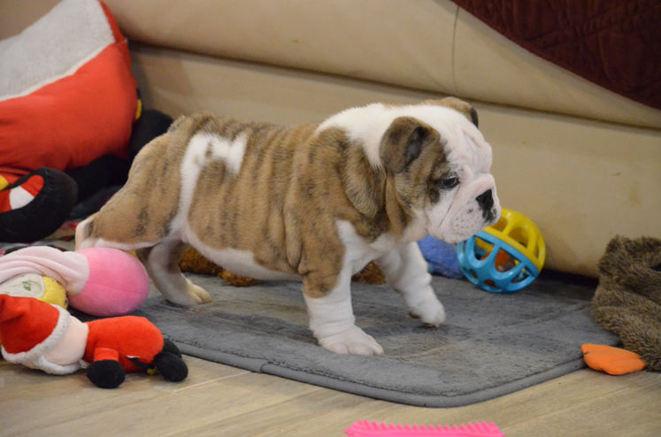 We have one fawn brindle and white female Bulldog puppy available. The puppy was born on 12/07/2025. Her sire is Grand Champion Cherokee Legend Alfie RN CGC TKN BN-V VHMP VSWE, and her dam is D And D's Cindy Lou Who.